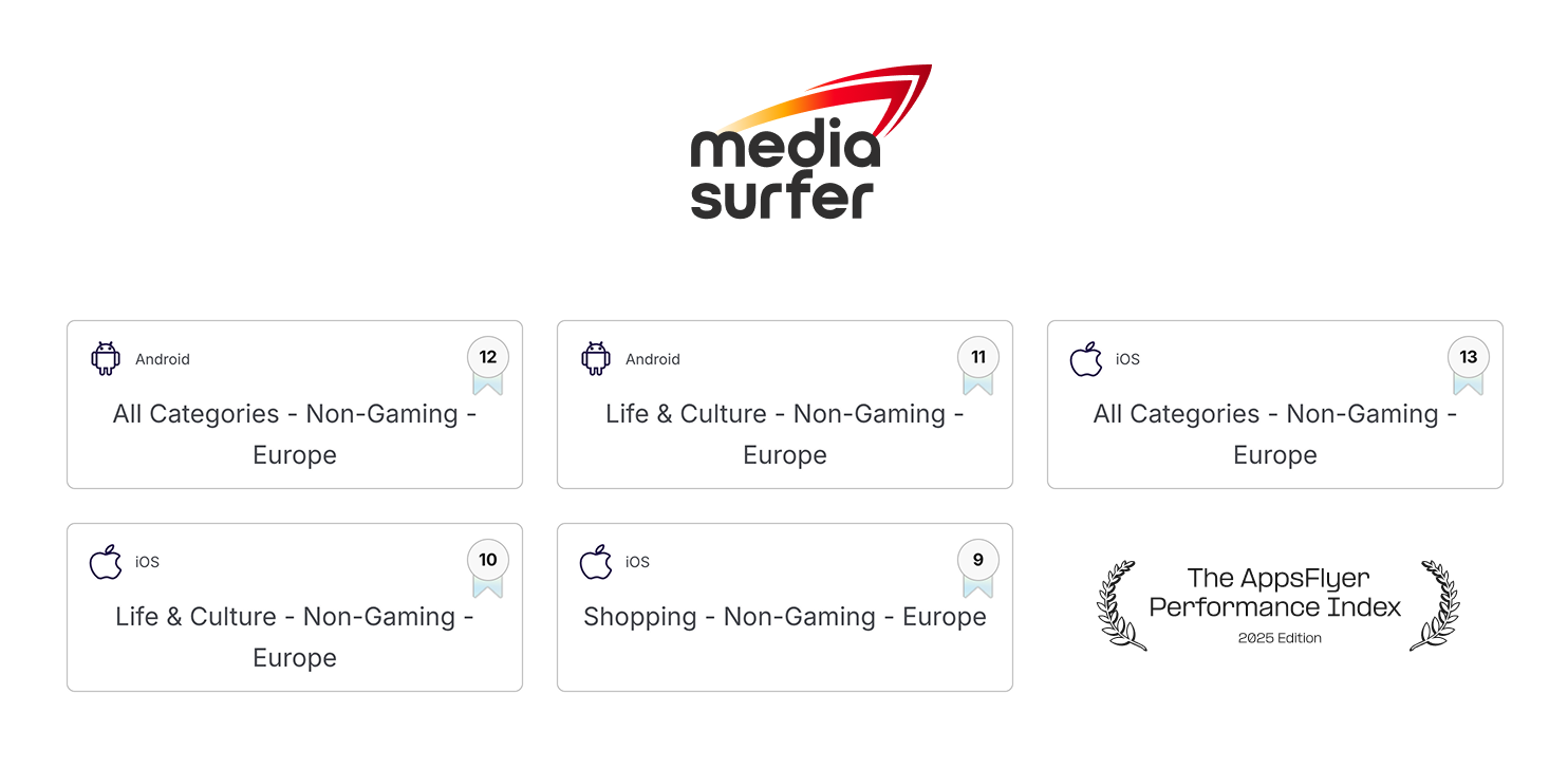 Mediasurfer ranked #9 in the AppsFlyer Performance Index 2025 in the Shopping Remarketing (Europe) category.
